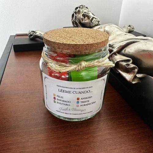 Cada frasco está cuidadosamente elaborado para inspirar reflexión diaria y fortalecer tu conexión con Dios.